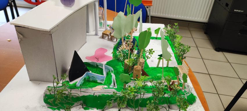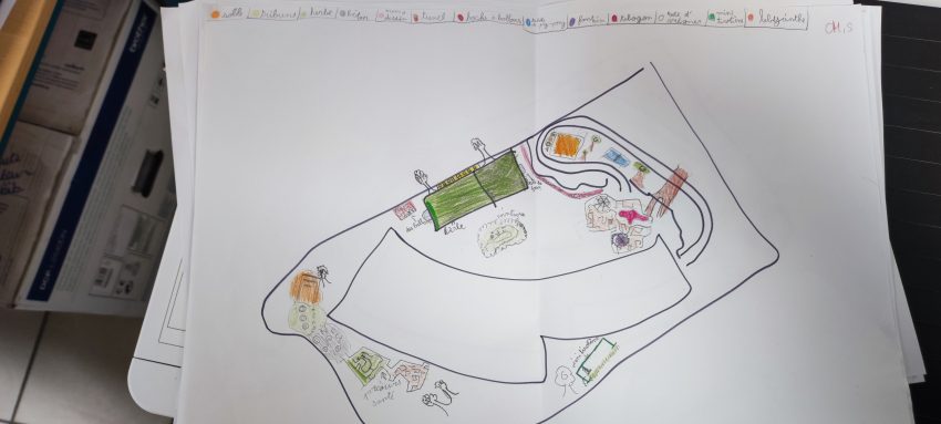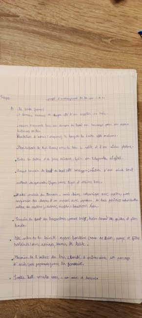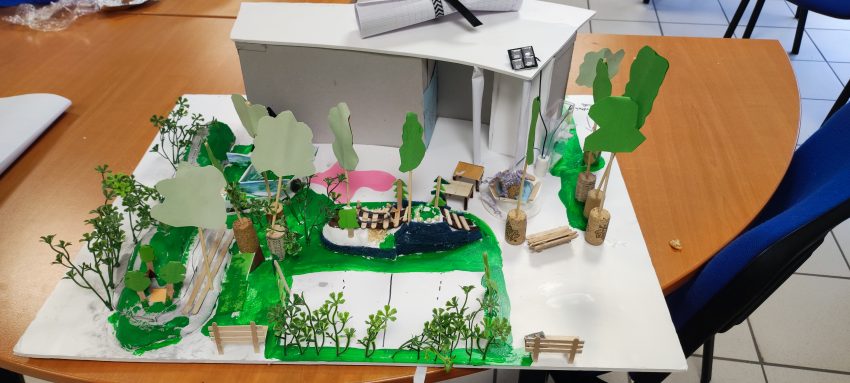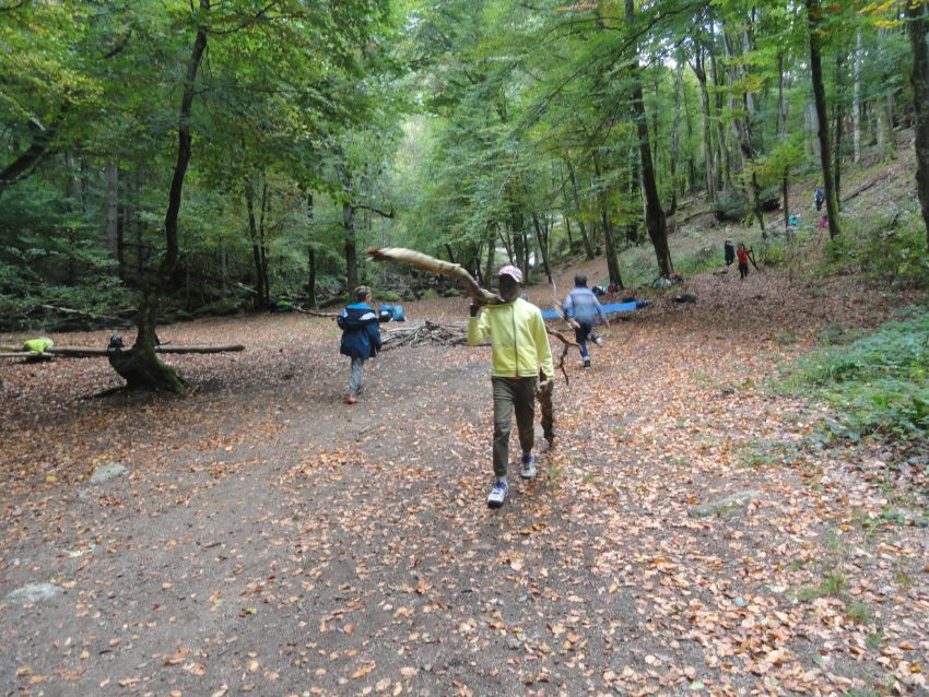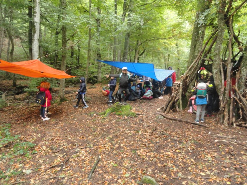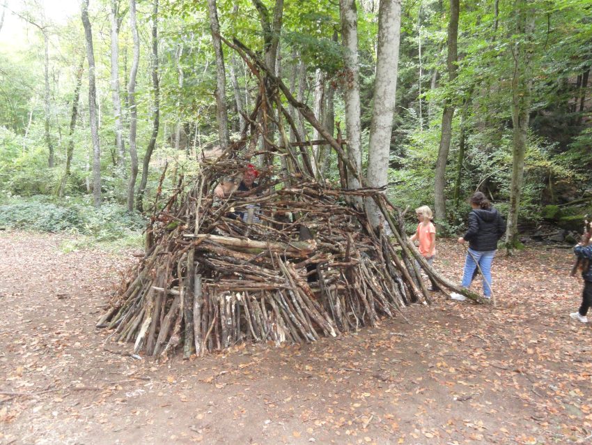 Sabir, Léonie, Aria, Joy et Maxime: On est allé chercher du bois mort dans la forêt pour construire une grande cabane. Après, on a mis une bâche dessus quand il pleuvait beaucoup et on s’est abrité dedans.