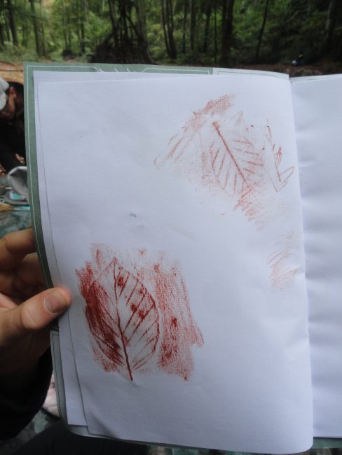Nous avons utilisé nos carnets pour décalquer les différentes feuilles d’arbres (hêtres et chênes) et fougères avec des craies grasses. C’était très joli comme effet!