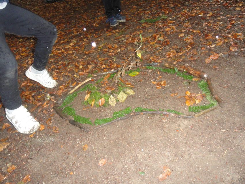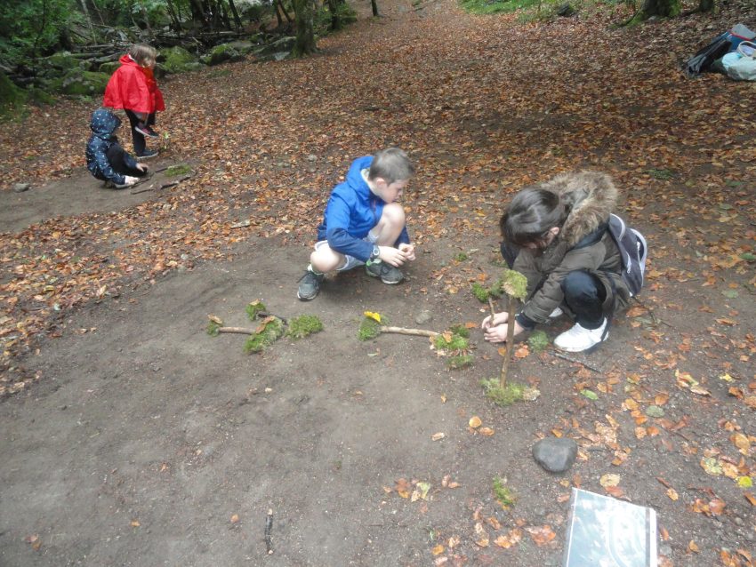On a fait des tableaux de la forêt dans un cadre sur le sol. On a pris des éléments de la nature autour de nous: branches, feuilles de toutes les couleurs, mousses. On n’a pas pu les terminer à cause de la pluie!